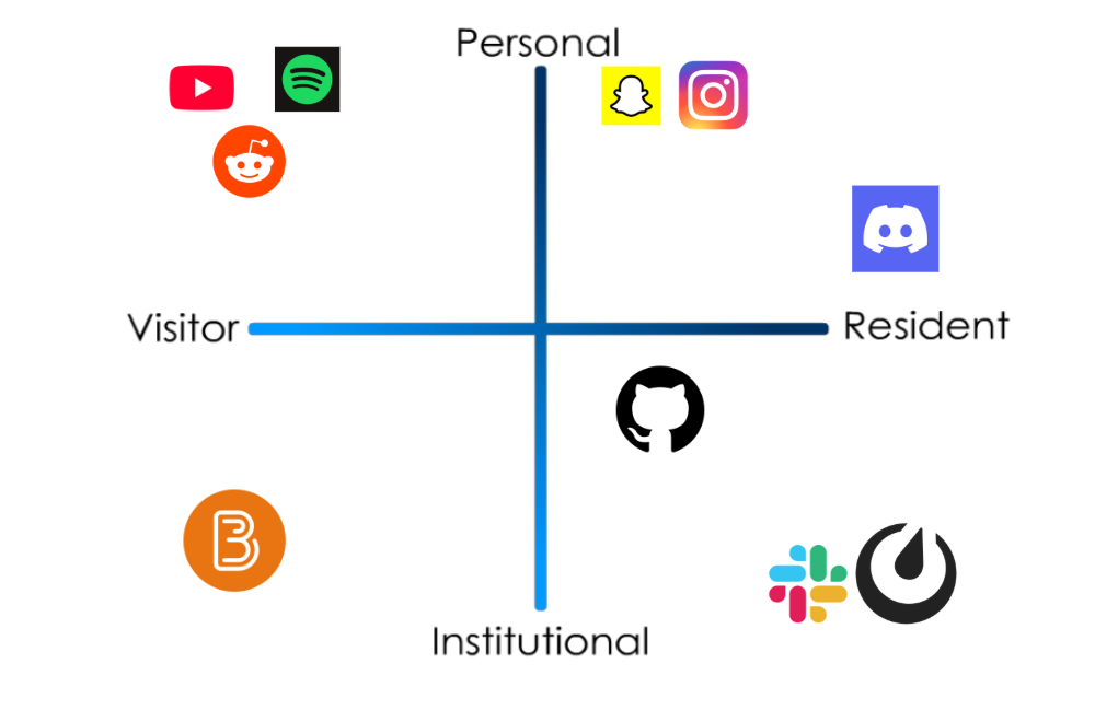 Overall, my map shows stronger Resident engagement in personal spaces and growing resident engagement in professional spaces. I think its only natural since I am definitely becoming more intentional about building a visible professional digital identity as I approach graduation. In the Personal-Visitor quadrant, Youtube, Reddit, and Spotify are similarly grouped because I only use it to consume media, never to post or interact with anyone. The Personal-Resident quadrant has Snapchat, Instagram, and Discord, where Snapchat and Instagram lean more towards visitor as I rarely post, but do frequently message my friends. Whereas, Discord leans more towards resident as its my main form of communicating with friends. UVIC also has a discord server which I use to communicate with peers of similar classes. Hence why it leans towards institutional. The Institutional-Visitor quadrant has Brightspace, where I only view course slides and submit assignments. The Insitutional-Resident quadrant includes Github, Slack, and Mattermost. Github is a collaborative version-control tool, where you can collaborate on projects with others (or by yourself.) Slack and Mattermost are quite similar where you communicate with your peers in a professional setting.